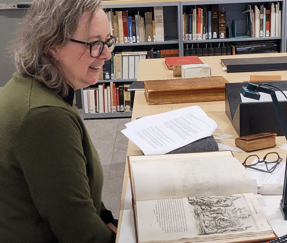 L’APR-UQAM a organisé une visite à la bibliothèque de l’UQAM le mardi 25 mars 2025. Cette visite, qui a été présentée par Lyse Roy, professeure au Département d’histoire de l’UQAM, a donné un aperçu des livres rares de la collection de l’UQAM. M. Hugues Ouellet, bibliothécaire et directeur de la découverte et du traitement des ressources documentaires et patrimoniales, nous a chaleureusement accueillis et fait visiter la réserve où sont conservés les ouvrages rares. Il nous a raconté la provenance des différents fonds, particulièrement ceux des bibliothèques du Collège Sainte-Marie de Montréal — j’ignorais qu’il y avait eu quatre bibliothèques dans ce collège. D’autre part, ma collègue historienne du Département d’histoire, Lyse Roy, qui a travaillé sur ces livres rares, nous a parlé brièvement des recherches de Brenda Dunn-Lardeau (études littéraires), pionnière dans la valorisation du patrimoine livresque des 15e et 16e siècles. Lyse nous a aussi parlé d’une autre collègue Peggy Davis (histoire de l’art), avec qui elle a travaillé sur des récits de voyages illustrés des 17e et 18e siècles au sein d’une équipe interdisciplinaire subventionnée.